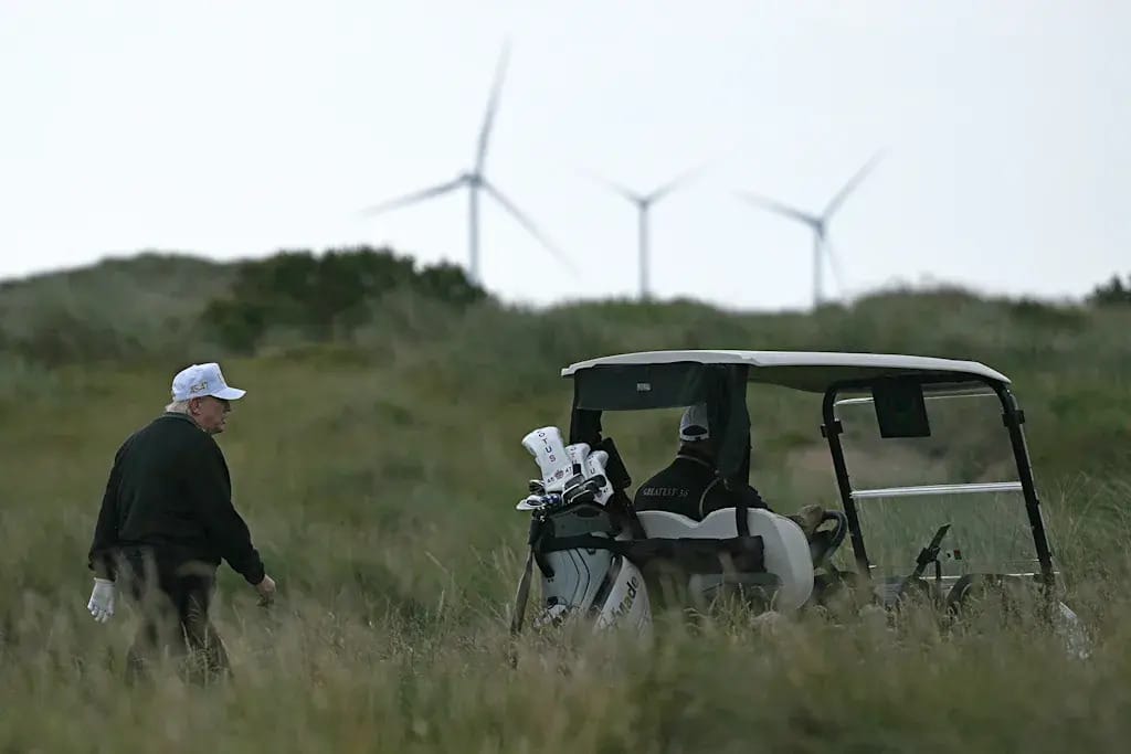 Trump at opening of the Trump International Golf Links course in Balmedie, Scotland; the Aberdeen Bay Wind Farm is in the background. Photo: Brendan Smialowski/AFP via Getty Images